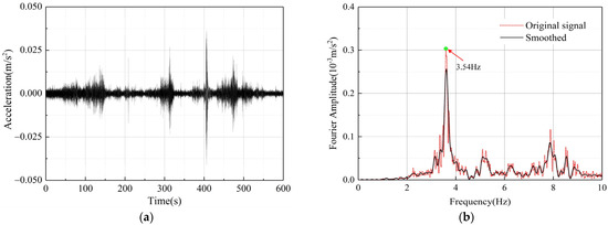 Figure 4 shows the acceleration response and corresponding fast Fourier transformation (FFT) spectra of the suspended floor at measurement point 1 under ambient excitation. It is noteworthy that taking a lowpass filter to remove the mixed noise of the frequency above 10 Hz [41,42,43]. In Figure 4b, the peak frequency is about 3.54 Hz, which is the first modal fundamental frequency of the suspended floor.