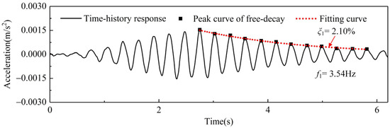 Free vibration tests were conducted by applying heel impact on the structure [44,45,46]. A typical free-decay acceleration response of the suspended floor at test point 1 is presented in Figure 5. The modal damping ratio of the suspended floor was identified using the exponential function to fit the envelope curve of the free-decay acceleration response. Accordingly, the first-order vertical modal damping ratio of the suspended floor was determined as 2.10%.