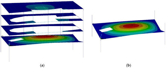Figure 10 demonstrates the first-order mode shape of the suspended floor predicted with the two FE models. The inter-story coupling effect in the overall FE model mainly behaves in the vibration of the top floor slab, which increases the modal participation mass. Notice that the first-order modal masses of the overall FE model and the local equivalent FE model are calculated to be 125,207.67 kg and 121,009.81 kg, respectively.