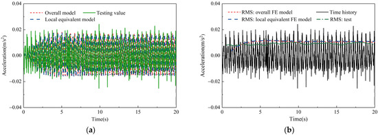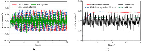 Figure 11, Figure 12 and Figure 13 compare the numerical and measured vertical acceleration time-history responses and vertical RMS acceleration of the suspended floor subjected to pedestrian-induced loads under cases WP-1, WP-2, and WP-4. With the increasing number of pedestrians, numerical acceleration responses are significantly higher than the corresponding field test results. It can be concluded that there are minor differences in pedestrian walking frequency, which enhances the randomness of the crowd and reduces the actual vibration responses of the suspended floor. Additionally, it has been found that the predicting value considering the crowd-structure interaction (CSI) effect is much closer to the measured acceleration than that without considering the CSI effect [50]. It is noteworthy that the RMS acceleration responses predicted with the overall FE model are in good agreement with those of the local equivalent FE model, and thus the simplified local equivalent FE model can replace the complicated overall FE model to predict the practical dynamic responses of the floor subjected to pedestrian excitations.