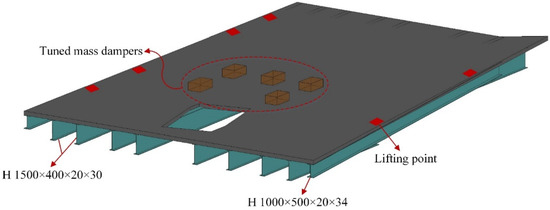 Considering the engineering purpose of cost saving and easy installation, the mass ratio of TMDs installed on the structure is determined to be , and its specific design parameters are listed in Table 3. The number of TMDs was determined to be five, and the installation locations of TMDs on the suspended floor are shown in Figure 15.