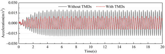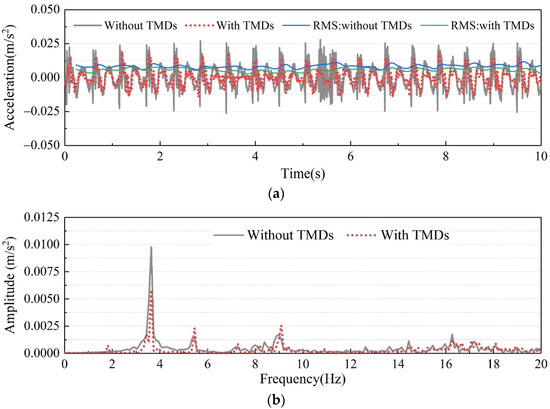 For the case of walking in place, it can be observed from Figure 18 that the peak acceleration decreased from 0.0095 m/s2 to 0.0061 m/s2. The maximum RMS value induced by a single pedestrian is reduced by approximately 35.79%, indicating that TMDs can effectively mitigate the structural vibration response.