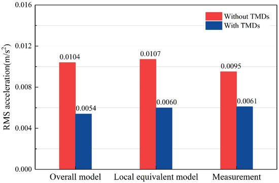 The RMS accelerations of the suspended floor with and without TMDs under case WP-1 are further compared in Figure 19. For the suspended floor without TMDs, the suspended floor’s RMS acceleration responses predicted by its overall FE model and local equivalent FE model under case WP-1 reach 0.0104 m/s2 and 0.0107 m/s2, respectively, which agree well with the corresponding field test result of 0.0095 m/s2. For the suspended floor with TMDs, the suspended floor’s RMS acceleration predicted with its overall FE model and local equivalent FE model under case WP-1 reach 0.0054 m/s2 and 0.0060 m/s2, respectively, which are in good agreement with the corresponding field test result of 0.0061 m/s2. Therefore, it can be concluded that the simplified local equivalent FE model can replace the complicated overall FE model to predict the human-induced dynamic responses of the suspended floor.