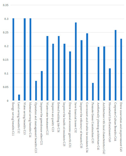 The overall ranking of indicator weights is shown in Figure 1. Among all the influencing indicators, the most significant are energy saving (C11), water saving (C13), and material saving benefits (C14), followed by wastewater treatment (C32) and extending building life (C24), then followed by improving air quality benefits (C23) and saving financial losses (C32).