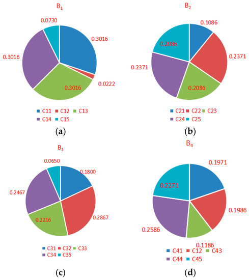 The weighting diagram of scheme layer indicators. (a) Weights of C11-C15. (b) Weights of C21-U25. (c) Weights of C31-U35. (d) Weights of U41-U44.