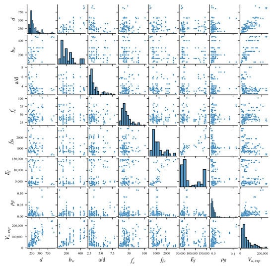 For the shear design provisions and ML approaches, the input information of the beam specimens includes beam geometry (effective depth and web width ), testing setup (ratio of shear span to effective depth ), concrete strength , flexural bar parameters (tensile strength , Elastic Modulus and Reinforcement ratio ) and ultimate capacity (total shear force ). The database statistics are summarized in Table 2. The distributions of input features and correlations between them are shown in Figure 2.