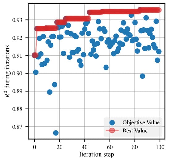 where, is chosen as the -quantile of the objective values (0.15 by default) and and are density estimates with corresponding objective values smaller or greater than , respectively. The best is the hyperparameter set to maximize Equation (6). Finally, hyperparameters of the predictive model for concrete compressive strength are optimized using Bayesian optimization, which randomly generates innumerable candidate hyperparameter configurations and selects as the minimum value.