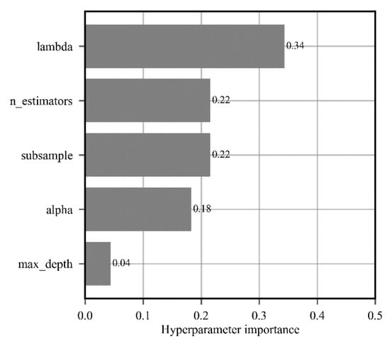 The optimization history XGBoost is shown in Figure 3. Hyperparameters of other ML models are tuned automatically with the same procedure using Bayesian optimization. is set to be the objective value. The initial value is low, and as the optimization progresses, the value of TPE of Bayesian optimization for the hyperparameter makes the model performance tend to be better. The best result is 0.9362 in the validation set. The hyperparameter importance of the XGBoost is shown in Figure 4. The hyperparameter importance is calculated by Hutter []. All the importance values are summed up to 1.0. The most important hyperparameter of XGBoost is lambda. The number of estimators ranks second. The range of the important hyperparameters is set iteratively to ensure including the best values. With the aid of hyperparameter importance, users could pay more attention to setting the ranges of the relatively more important hyperparameters. It will greatly help reduce time consumption and manual intervention.