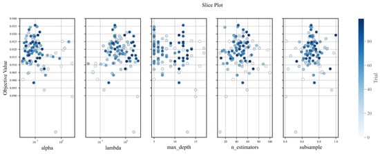 The hyperparameter optimization process for 100 iterations is shown in Figure 5. Due to space limitations, only the model and five most important features of XGBoost are listed in the Figure 5. The principles of the optimization process of other models and hyperparameters are similar. It should be noted that, compared with grid search in the optimization process of Bayesian optimization, the value of a single hyperparameter does not increase in one direction. The value of a single hyperparameter is determined by TPE, and the value that increases EI the most is chosen. The iteration steps are denoted by colors, which show the optimization process of hyperparameters. It can be seen that the hyperparameter values at the beginning of the iteration are relatively discrete. In the later stages of the iteration, the hyperparameter values are gradually concentrated in the area that maximizes the objective value improvement. Compared with grid search and random search, this kind of Bayesian optimization based on prior information can effectively reduce the search time of hyperparameters, reduce manual intervention and can obtain more accurate results.