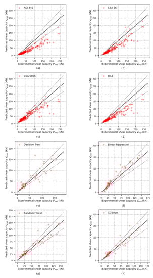 Figure 13 shows that the shear strength predictions vary with increasing concrete strengths from 25 MPa to 60 MPa. As shown in Table 1, the predictions of the codified design provisions are related to or . The XGBoost model and JSCE predictions show a similar curve slope related to . With nonlinear relations between and the shear predictions, the Linear Regression model is more sensitive to the increasing than to the remaining prediction curves. The curve slope of the Random Forest model is similar to that of the CSA S6 and ACI 440 but with higher predictions, although it does not show explicit relation with , and the validity of the prediction curve is still higher.