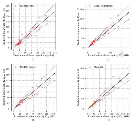 Comparisons of test results and predictions of shear design provisions and ML models: shear design provisions: (a) ACI 440, (b) CSA S6, (c) CSA S806, (d) JSCE; basic ML models: (e) Decision Tree, (f) Linear Regression, (g) Random Forest, (h) XGBoost; ML models with additional features: (i) Decision Tree, (j) Linear Regression, (k) Random Forest, (l) XGBoost.