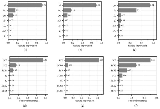 By implementing the additional features, the most important influencing factors become the selected ones. As shown in Figure 7, the Decision Tree, Random Forest and XGBoost models’ predictions are more relative to the features SC2, SC3 and SCR5. This indicates that for these models, the combination of concrete strength, cross-section and reinforcement stiffness in shear capacity predictions plays a more important role than other features, as shown in Table 3.
