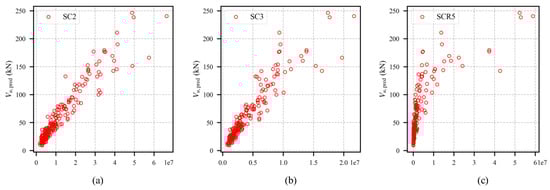The significant improvement of the Linear Regression model could be attributed to the added features. The additional features have more linear relations with the predictions of the shear capacities of the database, as shown in Figure 8, and these linear relations could help to improve the accuracy and consistency of the Linear Regression model.
