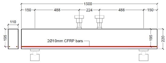 To further verify the validity of the proposed data-driven ML models with the artificial features for individual tests, the test results of two FRP-reinforced concrete beams without shear reinforcement tested by the authors (design configurations shown in Figure 9 and material properties shown in Table 5) are compared with the predictions in Table 6. Both of the two beams failed in shear as expected (Figure 10) with an average shear resistance of 19.3 kN (38.5 kN total applied load).