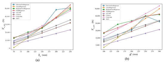 The effects of the beam cross-section dimensions are shown in Figure 11. For the web breadth, most of the predictions from shear design provisions increase linearly with , as it is normal to assume the shear stress keeps constant at failure. The same linear relationship is shown by the Linear Regression model but with a high slope. For the remaining ML models, the shear capacity increases with different slopes at a different level of . This could be attributed to the data distribution in the train set.