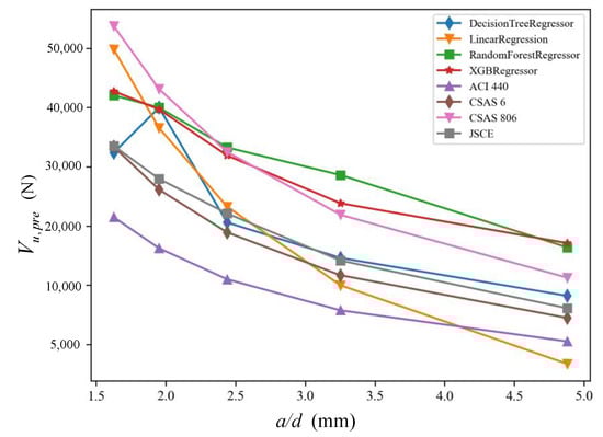 For the ratio of shear span to effective depth, all codified models and the Linear Regression model share a very similar trend (Figure 12). Random Forest model and XGBoost model show an approximately linear reduction of shear predictions along with the increasing . Similar to the inconsistent performance in the analysis of beam cross-section dimensions, the Decision Tree model also has the odd drastic change of shear predictions, as this model is sensitive to the train set of the database.