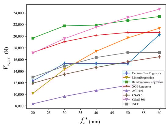 For the effective depth , low nonlinearity is also seen from the JSCE prediction curve for the corporation of the factor of in Equation (1), while for the remaining codified predictions, a linear relation between shear prediction and effective depth is found. The Linear Regression model also has a linear relation between and the shear prediction with a higher slope than all codified predictions. The XGBoost and Random Forest model share a similar trend with JSCE with higher prediction values, which is also a reason for the higher accuracy. Note that the Decision Tree model has drastic slope changes between 200 mm and 300 mm effective depth. This could be caused by a relatively simple single model structure compared with other ensemble models such as XGBoost. The prediction results of the model may be affected by some outliers in the training set.