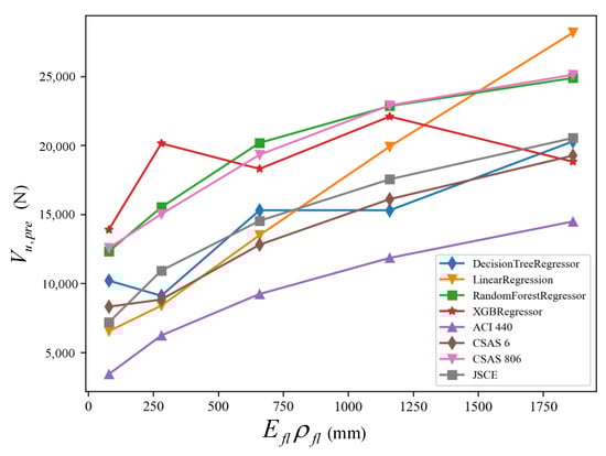 As increasing the FRP reinforcement ratio and elastic modulus could result in a more effective aggregate interlock and limit crack width, the shear design provisions consider this axial rigidity effect by incorporating directly or indirectly. However, as shown in Figure 14, all the shear provisions show a similar trend, which is a function of or . The Random Forest model shows a very similar prediction curve with the CSA S6, whilst the Linear Regression model shows a linear function of . The remaining two ML models cannot effectively provide an explicit trend for the variation of .