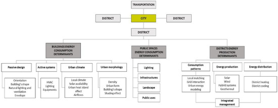 Figure 1. Energy determinants implied in each scale, focusing on the district balance towards an NZED. Reproduced with permission from [7], Elsevier, 2018.
