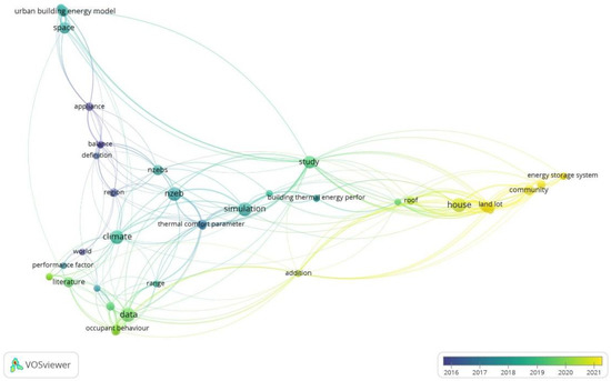 The factors found in the literature have been shown to have an important influence both in obtaining decreases in energy consumption and achieving zero energy balance and goals. Table 1 summarizes the information described from the selected investigations. Based on this bibliography, a map was made in VOSViewer software v1.6.18.0 to illustrate the co-occurrences of terms in the title and abstract from the text data [28]. The complete count method was used, and due to the low number of references, a minimum number of two-term occurrences was selected. Figure 2 illustrates the results by the average publication year, where the most relevant terms are “data,” “house,” “climate,” “nzeb,” and “simulation,” which are repeated more than seven times. It is also noted that the most recent research has a focus more closely linked to ZED, as terms such as “community” and “energy storage system” are found.