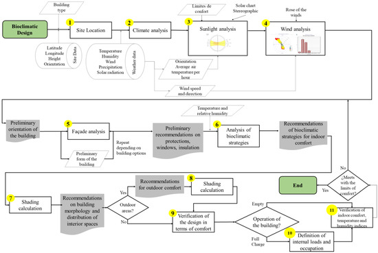 Based on EC, the first re-design proposal for the building and its distribution (RC) considers a bioclimatic methodology and the application of the results obtained through a parametric analysis. Figure 5 presents the systematization of bioclimatic design. The input data and variables are visualized for each of the steps in the analysis: start, site location, climate analysis, sunlight analysis, wind analysis, façade analysis, bioclimatic strategy analysis, shading calculation, and design verification in terms of comfort and completion of the process. For the analysis, meteorological data provided by Solargis© (temperature, relative humidity (RH), radiation, wind, and precipitation) were used for the area specified in Figure 4.