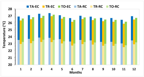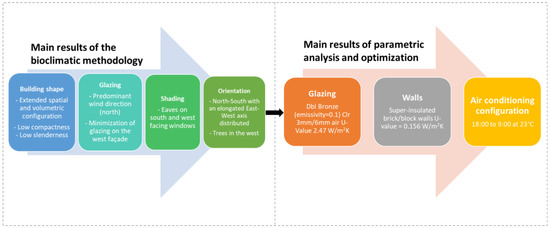 The 3D model of EC was subjected to a parametric analysis in the DesignBuilder software, considering the data for March (the month with the highest temperatures according to climate data) to select adjustments in the design variables that allow a greater performance of the urbanization (temperature and schedule) of air conditioning use, orientation, and glass materials, walls, and roofs) and combine it with the results obtained when applying the bioclimatic methodology. The analysis evaluates multiple design options and their influence on the variables of interest, allowing for observation of the behavior of the different design combinations; in this way, the best options are detected and selected for subsequent application in RC.