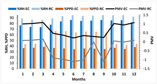 - Givoni’s chart proposes building design measures as a function of temperatures and humidity. The results indicate that the buildings under the climatic conditions studied only achieve 14 hours of comfort per year. To increase comfort hours, the software suggests using window sun protection (an additional 2379 h), dehumidification (an additional 3178 h), and cooling and dehumidification (an additional 5566 h). The set of strategies extracted is shown in Figure 7.