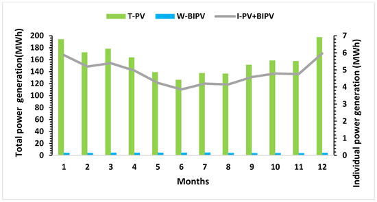 The reduced energy needs of buildings must be met with on-site renewable energy to achieve nearly zero energy targets. Once the proposed urbanization is obtained, the generation of electricity is evaluated. The use of PV technology was chosen for the following reasons: (1) The literature showed that using PV panels is the most widely employed energy solution to achieve zero or nearly zero energy objectives in residential buildings. (2) In Panama, there is a higher solar potential than wind in most countries [39]; the average radiation of the site is 4.96 kWh/m2day. (3) Simplicity and precision in energy modeling in available tools and in future applications when studies are carried out at a constructive scale. In addition, this technology’s availability in the local market facilitates its application.