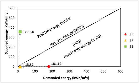 The nZEB concept has been adapted to define a Nearly Zero Energy District (nZED) and a Net Zero Energy District (NZED) as a bounded part of a very energy efficient city with a quantity of energy generated from renewable sources produced on site or nearby [7,13] that includes an iteration between buildings, residents, streets, sidewalks, and vegetation. Zero energy districts are not limited to individual buildings, but comprise several buildings and optimize energy efficiency, thermal energy, and renewable energy generation between those buildings to offset demand [14,15].