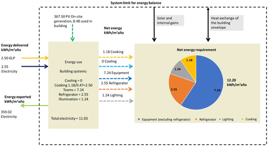 The energy balance (EB) is calculated from the energy delivered to the building (consumed) and exported (generated) for each type of energy source [40,44]. This indicator summarizes all power supplied and exported in a single value using Equation (1):