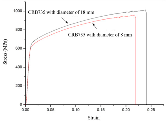 Stress-strain relationship curves for CRB735 with diameter of 8 mm and 18 mm.