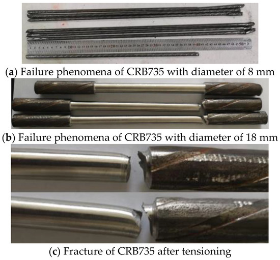CRB735 steel reinforcement have a yield strength of 600–1100 MPa and an elongation of more than 20%, taking into account the advantages of high strength and high elongation. Two main types of CRB bars with nominal diameters of 8 mm (mean 8.0 mm) and 18 mm (mean 17.5 mm) were used in this test samples and the stress-strain relationships are shown in Figure 1. The failure phenomena of the bars after tension are shown in Figure 2.