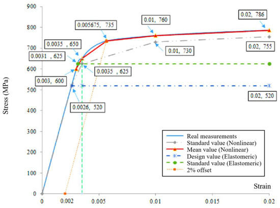 For the non-linear analysis, the standard value constructive model for CRB735 at 95% guarantee is taken as a four-fold line model, as shown in Equation (2). The standard value of yield compressive strength is taken as 500 MPa. The standard value of proportional ultimate tensile stress is taken as 520 MPa; nominal yield strain 0.0035, nominal yield stress 625 MPa; strain 0.01 corresponds to a stress of 730 MPa; ultimate strain 0.02 corresponds to an ultimate strength of 755 MPa.