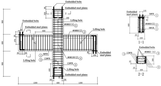 A total of five cruciform joints (ZJ-1-ZJ-4 and ZJ-2A) and two side joints (BJ-1 and BJ-2) were designed. The longitudinal reinforcement and stirrups in the cruciform joints ZJ-1-ZJ-4 and side joints BJ-1-BJ-2 are all made of CRB735 high-strength bars, while those in the cruciform joint ZJ-2A are made of HRB400 bars. According to the design principle in provision 3.2.2 in GB50010-2010 Code for Design of Concrete Structures [27], the reinforcement in the beams, column and core area of each specimen is shown in Table 4. All specimens were made of C35 concrete, with the axial compression ratio and the core zone volume stirrup ratio as the main variables. The reinforcement details are shown in Figure 4, Figure 5, Figure 6 and Figure 7.