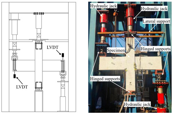 The tests were completed at the Shandong University Structural Hall with the loading device shown in Figure 8. Three identical 400-tonne hydraulic jacks were used to apply the load. The hydraulic jack on column top is used to apply a constant vertical axial force. The lower end of the jack is connected to the hinge support, which is connected to the column top. At the same time, lateral supports are provided on both sides of the column top to limit the horizontal displacement of the column. Two jacks are connected to the free ends of the two beams for applying antisymmetric cyclic loads.