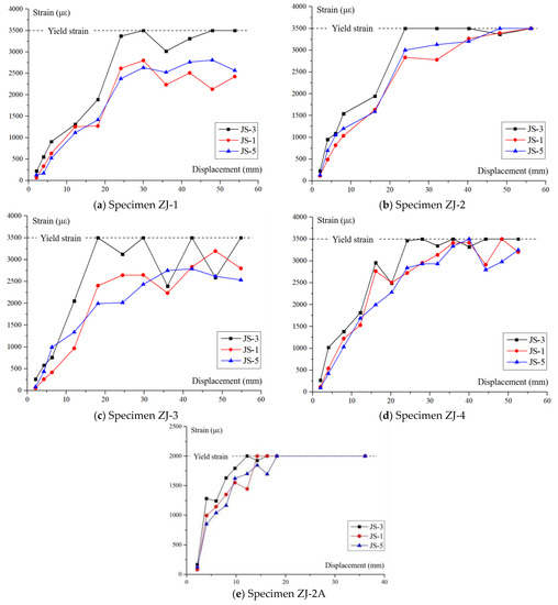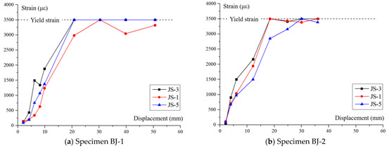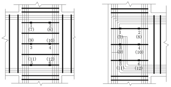 The axial force at the column top is measured by the transducer and monitored throughout with a static resistance strain generator to ensure that the axial force is constant during the loading process. The load values at the beam ends are also measured by the corresponding transducers. At the same time, two Linear Variable Displacement Transducers (LVDTs) with the displacement of 100 mm are installed at the beam ends to record the displacement data in real time. In addition, to observe the strain of the stirrups in the joint core during loading, three stirrups in the core were selected after the reinforcement cage was tied and two resistance strain gauges of 6.9 mm × 3.9 mm were attached to each stirrup parallel to the direction of force. The location and numbering of the specimen measurement points are shown in Figure 10. All the above measurements were taken by a computer in real time. The crack development of each loading level was carefully observed, the maximum crack width corresponding to the loading level was recorded using a crack comparison card and photographs of the cracks were taken.