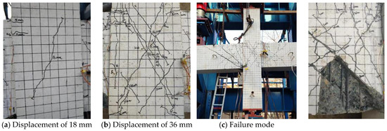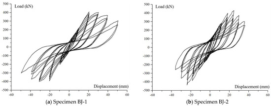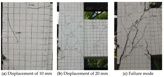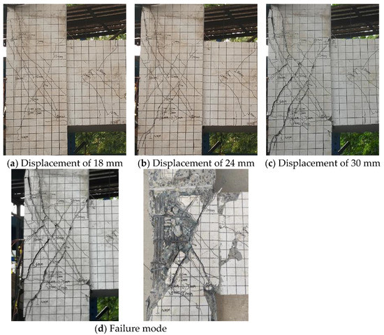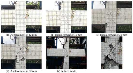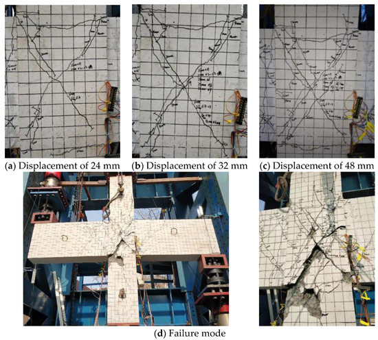 For specimen BJ-1, when the displacement was loaded to 10 mm, two cross diagonal cracks appeared in the joint core. When the displacement reached 20 mm, the original diagonal cracks in the core rapidly crossed the diagonal while several new diagonal cracks were added, with the widest reaching 1.10 mm. When the beam end was loaded at 40 mm, the peak load started to drop, but the damage to the concrete protection layer in the core was not yet serious, at which time the main diagonal cracks expanded to 1.50 mm wide. When the beam end was cyclically loaded at 50 mm, the peak load dropped to about 300 kN and shear failure to the core occurred. The crack development and failure mode of the specimen is shown in Figure 16.