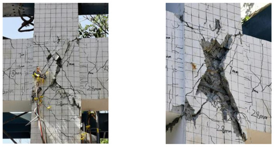 (2) Although the longitudinal reinforcement at the beam or column ends reaches yield, the corresponding section is not completely damaged and can still continue to carry the load. In contrast, the concrete in the core area is softened with the increase in cyclic loading, the compressive strength is continuously reduced, and the concrete in the core area is eventually crushed diagonally before the beam and column ends, which leads to the overall failure of the joint;