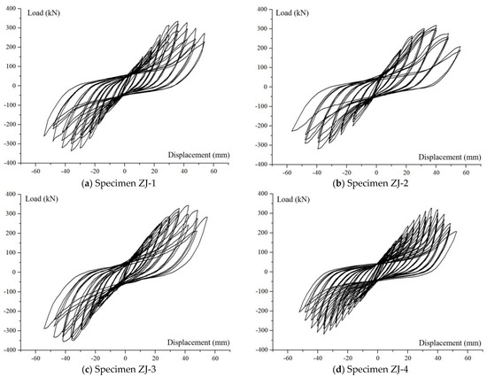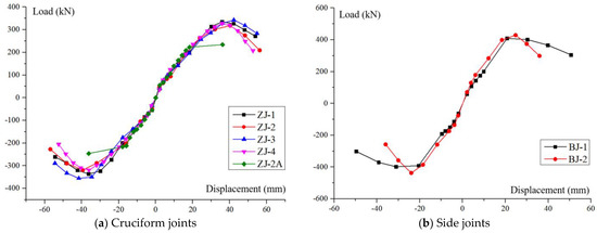 For specimen ZJ-3, the first diagonal crack appeared in the joint core when the displacement was loaded to 6 mm. When the displacement reaches 18 mm, cross cracks are formed in the core, with the widest cracks of 0.9 mm, and when the displacement reaches 24 mm, several new minor cross cracks are added to the core. At this stage, the bending and shear cracks in the beams are developing rapidly, with cracks extending to one-half of the beam height. When the displacement reaches 36 mm, the main cracks expand and the concrete protection layer on both sides of the crack starts to spall. When the displacement reaches 42 mm, the joint-bearing capacity reaches its maximum, with a positive ultimate load of 343.0 kN and a negative load of 355.6 kN. When the loading continues until the displacement at the beam ends reaches 54 mm, the concrete in the core is sheared, the protective layer is spalled off and the stirrups are exposed and deformed. The crack development and failure mode of the specimen are shown in Figure 14.