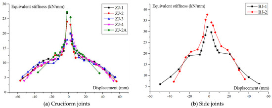 where, Ki is the equivalent stiffness of the joint; Fi is the peak load of i-th cycle; and Δi is the displacement corresponding to the peak load of i-th cycle. The stiffness degradation curves for each specimen are plotted as shown in Figure 23.