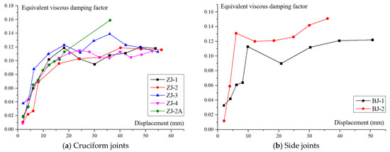 Based on Figure 24 and Equation (7), the equivalent viscous damping coefficient-displacement curves of all specimens are plotted in Figure 25.