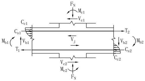 where, Cc1 is the combined compression on the concrete in the compression zone at the left beam end; Cs1 is the combined compression on the compressive longitudinal bars at the same side of the beam end; T2 is the combined tension on the tension longitudinal bars at the right beam end; Vc1 is the shear force on the column.