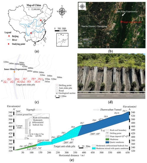 Basic information of the target anti-slide pile. (a) Location; (b) geographic location; (c) topographical map; (d) realistic picture; (e) engineering geological profile.