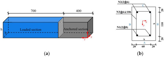 According to the similarity constants of individual physical quantities in Table 2, the dimensions and reinforcement information of the test pile are presented in Figure 2 and Table 3. The concrete grade of the test pile was determined to be C30, and the thickness of concrete cover was 20 mm. The pile length (L) is 1.1 m, in which the loaded section and the anchored section were 70 cm and 40 cm, respectively. The sectional width (b) and the sectional height (h) were 10 cm and 15 cm, respectively. The tensile steel bars at the rear side of the test pile were composed of two steel bars with a diameter of 8 mm (N1), and the steel ratio (ρ) was 0.67%. The structural steel bars at the front side of the test pile were composed of two steel bars with a diameter of 6 mm (N2), and the stirrup was composed of one steel bar with a diameter of 6 mm and a spacing of 106 mm (N3).