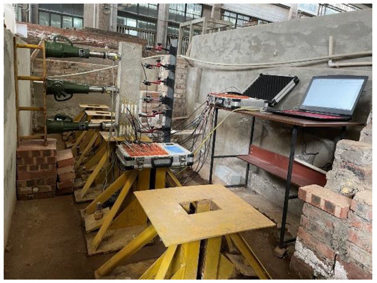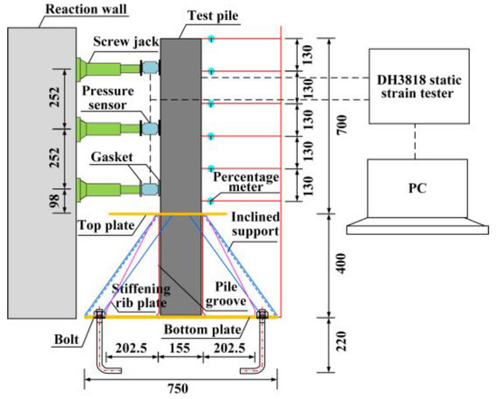 The thrust loading system was mainly composed of reaction wall, screw jack, and pressure sensor. The basic principle is that the trapezoidal load is applied by three jacks and reacting on the reaction wall and transferred to the test pile through the pressure sensor, as shown in Figure 5. The jacks were all screw jacks with a maximum lifting capacity of 10 t produced by Shanghai Baoshan Hugong Group, and were arranged at 9.8 cm, 35 cm, and 60.2 cm of the loaded section, as illustrated in Figure 7. The pressure sensor only played the role of load transfer in the thrust loading system, and its parameters are introduced in the following data acquisition system.