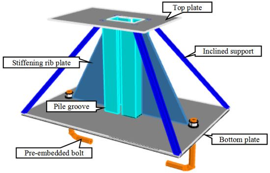 The test pile fixing system was mainly constructed by connecting the high-strength bolt embedded in the rigid foundation (the rigid foundation was mainly made of in-situ cast concrete and steel bars) with the steel support, which was used to fix the test pile to simulate the anchored section of the actual cantilever anti-slide pile. The steel support was welded by channel steel, angle steel, and steel plate, and its grade was Q235. The fixed part of the test pile was the pile groove formed by channel steel. Considering the dimensional error in the pouring process of the test piles, the size of the pile groove should be slightly larger than the section size of the test piles to facilitate the placement of the test piles, the size of the pile groove was designed as 105 mm × 155 mm, and the thickness of the pile groove was 10 mm. The stiffening rib plate was welded on the side of pile groove and the inclined supports (6 mm thick, mainly made of angle steel) were set at the four corners of the bottom plate to stabilize the pile groove. A rectangular working platform (top plate) was installed on the top of the pile groove, and its dimensions and thickness were 455 mm × 305 mm and 6 mm, respectively. The dimensions of the bottom plate were 750 mm × 500 mm, and its thickness was 10 mm. In order to ensure the stability of the steel support, the pre-embedded bolt component was set at the front and rear sides of the bottom plate of the steel support, which were anchored with the rigid foundation, and then the pile groove transmitted the thrust load to the pre-embedded bolt through the stiffened rib plate and inclined support to obtain the reaction force. The pre-embedded bolts adopted M20 bolts (matched with flat washer and nut), and the embedded length was about 230 mm. The three-dimensional concept diagram of the test pile fixing system is illustrated in Figure 6.