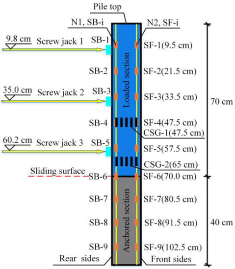 - Xie, Z.W. Study on Strain Characteristics and Internal Force Nonlinearity of Anti-Slide Pile. Master’s Thesis, China University of Geosciences, Wuhan, China, 2019. [Google Scholar]