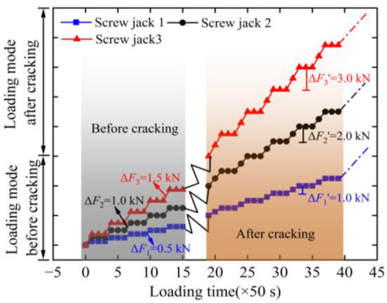 The loading step length (ΔF) in the loading process of the test pile should be determined by the loading magnitude (Fl), ultimate bearing capacity (Fmax), and loading rate (Vl). The loading step lengths of each level before and after the cracking of the test pile should be about 5% Fu and 10% Fu, respectively. When the load reached 90% Fu, the loading step length of each stage was loaded at 5% Fu until the test pile was damaged. Therefore, before the test pile cracked, the loading step length of the jack 1, jack 2, and jack 3 (ΔF1, ΔF2, ΔF3) in the loaded section were designed to be 0.5 kN, 1.0 kN, and 1.5 kN, and increased to 1.0 kN (ΔF1′), 2.0 kN (ΔF2′), and 3.0 kN (ΔF3′) after the cracking of the test pile. When the load reached 90%Fu, ΔF1, ΔF2, and ΔF3 were designed to be 0.5 kN, 1.0 kN, and 1.5 kN until the end of the test.