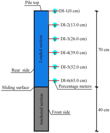 The data acquisition system mainly contains the percentage meter, strain gauge, pressure sensor, DH3818 static strain tester, and a laptop computer equipped with DHDAS dynamic signal acquisition system. The percentage indicator was applied to obtain the lateral displacement of the test pile, and a total of six percentage indicators (DIs) were arranged along the loaded section of the test pile in this experiment, which were 0 cm, 13 cm, 26 cm, 39 cm, 52 cm, and 65 cm from the pile top, respectively, as illustrated in Figure 9. The strain gauges on the steel bars were applied to measure the steel bars’ strains of the test pile and the type was BE120-3AA. It was arranged in two rows of 18 places on the tensile steel bars and the structural steel bars of the test pile, which were 9.5 cm, 21.5 cm, 33.5 cm, 47.5 cm, 57.5 cm, 70.0 cm, 80.5 cm, 91.5 cm, and 102.5 cm from the pile top, respectively. The concrete strain gauges were applied to measure the concrete strains of the test pile and the type was BX120-50AA. It was arranged in two rows of 10 places on Side B of the test pile (CSG-1,CSG-2), which were 47.5 cm and 65.0 cm from the pile top, respectively (Figure 7). The pressure sensors were arranged between the screw jacks and the test pile to obtain the applied loads. The type was CZLYB-1A and the measuring range was 50 kN.