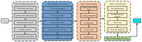 Figure 10 shows the main steps of this test. In Step 1, the steel strain gauges were posted according to the steel strain gauge arrangement scheme shown in Figure 7. Then the tension steel, structural steel, and the hoop steel were tied into a steel cage according to Figure 2b. The mold was made with wood boards according to the pile size and finally the pile concrete was poured and cured for 28 days. Step 2 was to set up the experimental system, including fixing the steel support, placing the test pile, laying screw jacks and pressure sensors, and connecting strain gauges and strain tester. Step 3 was to load the test pile with trapezoidal load by referring to the loading method in Section 2.4.2. Step 4 was to collect experimental data, including the pile displacement, residual bearing capacity, steel strain and crack development. Step 5 was to dismantle the experimental system and end the experiment.